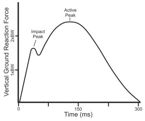 Figure 1 depicts a hypothetical vertical GRF curve for a heel-striking shod runner. The vertical (Y) axis displays the value of the vertical ground reaction force as a function of body weight, and the horizontal (X) axis shows time in milliseconds. The curve depicted on the graph shows how vertical GRF changes from the point of initial contact of the foot with the ground (time 0) to the point at which the foot leaves the ground on toe-off (about 300 ms). For a heel-striking runner there are typically two distinct force peaks.5,8-10 The impact peak, sometimes called the passive peak, is the vertical ground reaction force resulting from initial contact of the heel with the ground. Full body weight is not being applied at this point. The active peak, sometimes referred to as the propulsive peak, is the vertical GRF that occurs at roughly midstance, and its magnitude typically reaches two to three times body weight.11