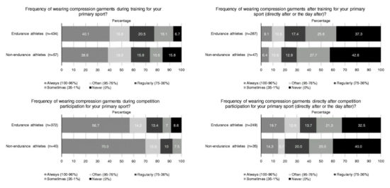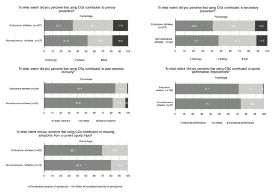 Figure 2 shows the perceived benefit of the CGs reported by the athletes for the reasons for which they indicated to use their CGs, i.e. primary injury prevention, secondary injury prevention, post-exercise recovery, sports performance improvement, and symptoms of a current sports injury. Among the endurance and non-endurance athletes, 77.1% (n=236) and 88.2% (n=30) perceived that using a CG “partially” or “strongly” contributed to secondary injury prevention, respectively. Further, 84.9% (n=203) and 81.8% (n=27) perceived that they recovered faster after exercise when using CGs, respectively.
