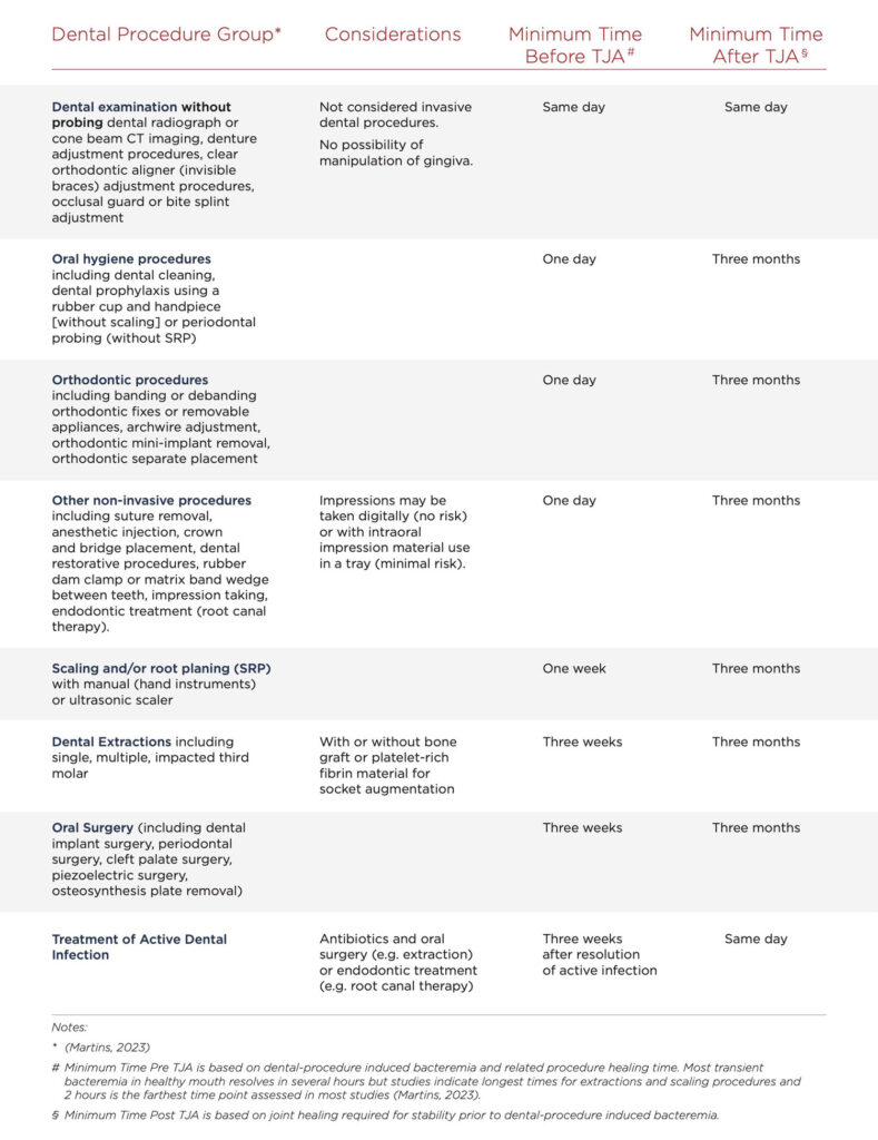 Source: AAOS/AAHKS. The prevention of total hip and knee arthroplasty periprosthetic joint infections in patients undergoing dental procedures. Available at https://www.aaos.org/globalassets/quality-and-practice-resources/dental/dental-2024/prevention-of-total-hip-and-knee-arthroplasty-pji-in-patients-undergoing-dental-procedures-cpg.pdf. Accessed Dec. 20, 2024.