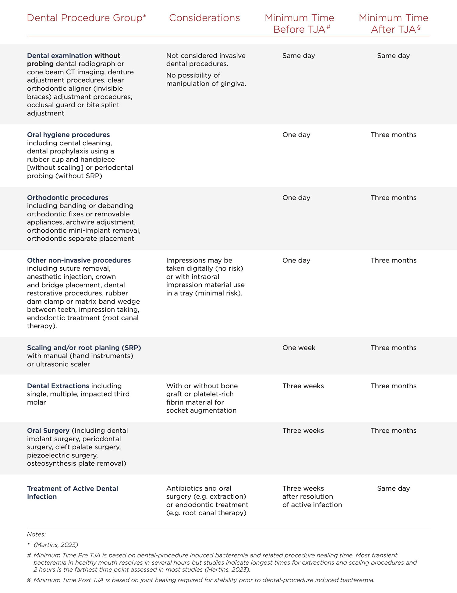 The majority of dental procedures should be delayed for up to 3 months after TJA based on the type of procedure performed.