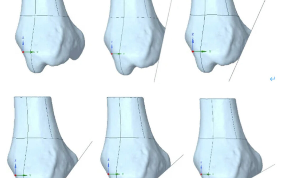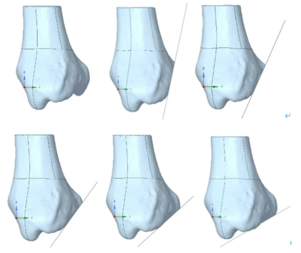 Within the study authors’ finite element analysis (FEA) project, they mapped the intricate contact interfaces between the articular cartilage and the underlying bone. Bridging different skeletal components, they synthesized a comprehensive static analysis model, which represented the full biomechanical gamut of the ankle joint. FEA was utilized to examine the stress distribution across the contact surface of the ankle joint, both in its natural state and under varied sagittal fracture line angles. (Figure 1)