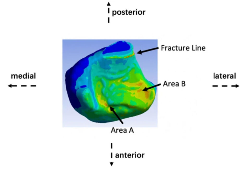 Three distinct stress concentration zones were identified on the ankle’s contact surface: the anterolateral tibia, the anteromedial tibia, and the fracture line (Figure 2).