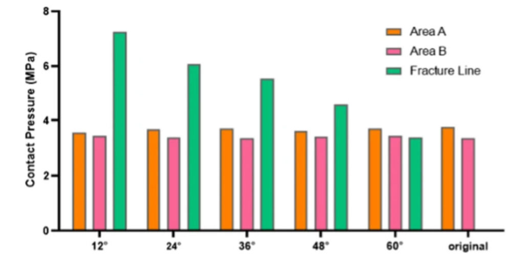 The most significant stress was observed at the fracture line when a fracture occurs. Stress at the fracture line notably spikes as the sagittal angle decreases, which can potentially compromise ankle stability. Larger sagittal angles exhibited only minor stress variations at the contact surface’s 3 vertices. It was inferred that sagittal angles below 60° might pose risks to ankle stability. (Figure 3)
