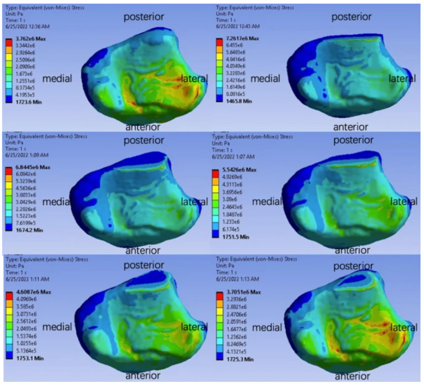 The study authors indicated that the alignment of their model’s stress predictions with those reported in empirical studies underscores its potential utility in a clinical setting. The maximum contact stress identified is particularly significant given its proximity to the values reported in cadaveric studies, which are often considered the gold standard for biomechanical analysis. This suggests that the model can reliably approximate in vivo conditions, providing a valuable tool for presurgical planning and postoperative evaluation. However, it is critical to note that while the model’s contact stress predictions are within the range of those found in the literature, the exact values may vary due to differences in methodology, sample size, and the biomechanical properties assigned to the tissues in different studies. Despite these potential variations, the consistency of the results herein with those of Kimizuka et al and Guan et al reinforces the robustness of this modeling approach.