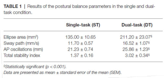 Consequently, the efficiency of the systems involved in postural balance control (ie, visual, vestibular, and proprioceptive systems) is crucial for people of different ages. Since the mid-seventies, an increased postural sway in the older adults has been recognized, in association with a higher risk of falling. Indeed, more than one-third of persons over 65 falls each year, and in half of such cases, falls are recurrent. Hageman et al found a larger area of sway in healthy older adults than in a younger group for all the studied conditions: eyes open, eyes closed, and with visual feedback. Similarly, Fernie et al demonstrated a greater sway path velocity in older adults who had fallen once or several times in a year with respect to non-fallers. However, a review by Rubenstein reported that the fall-risk is more tightly associated with dynamic than static conditions. Moreover, Blake et al identified tripping as the most recurrent fall-related event after a community survey on 1,042 individuals age 65 and over. This age-dependent decrease in postural balance control has been interpreted as deterioration of sensory, motor, or cognitive systems. Moreover, the reduced rate of force development in older adults has been associated with a lower capacity for neuromuscular response to control body balance. Older fallers demonstrated a reduced contractile rate of force development than non-fallers. Similarly, Paillard hypothesized a relationship between lower extremity strength and postural performance (ie, the stronger the muscles the better the postural performance), confirming the role of strength on postural balance control. A final aspect to consider is that many falls in older adults occurred when a secondary cognitive or motor task (ie, dual-tasking) was performed. Thus, the use of dual-task (DT) paradigms to predict falls among older adults is encouraged for its superiority over the employment of single-tasks (STs). The secondary task can be manual, discrimination and decision-making, mental tracking, verbal fluency, and working memory. Indeed, during dual-tasking, the 2 tasks reciprocally interfere with the performer’s attention overloading the cognitive sources. Therefore, the introduction of a secondary cognitive task over the motor one (ie, postural balance control) may help to understand the cognitive contribution involved in postural regulation both in static and dynamic conditions.