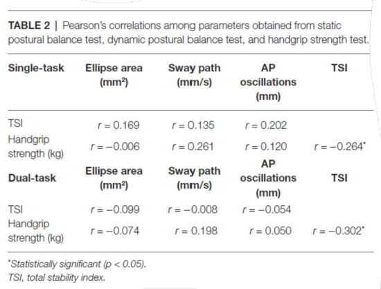 Table 1 reports the results of all parameters obtained from both static and dynamic postural balance tests. The results of the correlational analysis are presented in Table 2. In detail, Pearson’s correlation revealed non-statistically significant correlations between Total Stability Index and all the static postural parameters (namely, ellipse area, sway path, and maximal AP oscillations). Moreover, Pearson’s correlation did not show any significant correlation between the static postural parameters and handgrip strength. On the contrary, a weak though significant negative correlation was found between TSI scores and handgrip strength test both in the ST (P < 0.05; r = −0.264) and in the DT (P < 0.05; r = −0.302) condition.