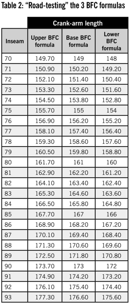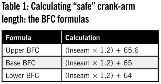 I’ve created Bike Fitness Coaching formulas (Table 1) that I believe are closer to ideal—to what a correct and “safe” crank-arm length should be. There are, in fact, 3 formulas: