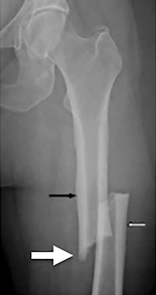Figure 1. Representative atypical femur fracture radiograph. A 65-year-old female patient was taking bisphosphonates for 6 years, with 6 months of progressive prodromal thigh pain. She had seen an orthopedic surgeon 1 month prior to the fracture with pelvic X-rays showing no evidence of significant osteoarthritis at the time. Note the periosteal thickening of the lateral cortices (black and white arrows), noncomminuted transverse fracture, and the medial cortical spike (big arrow) that are typically seen in atypical femur fractures.