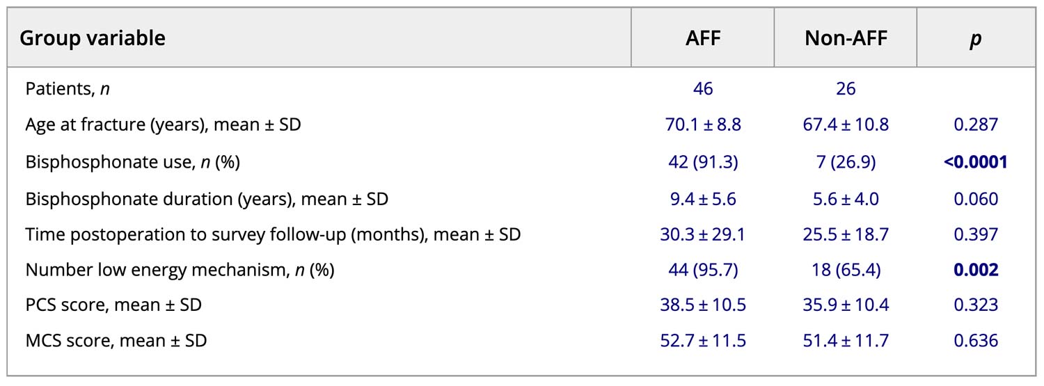 Table 1 details the group comparisons. Patients with AFF reported their postoperative physical and mental health to be no different than similarly aged patients with femoral diaphyseal fractures, as measured by the SF-36v2 Health Survey. These data suggest that mid-term patient-reported QOL outcomes are similar among women who sustain an AFF compared to a cohort of more typical femoral diaphyseal fractures.