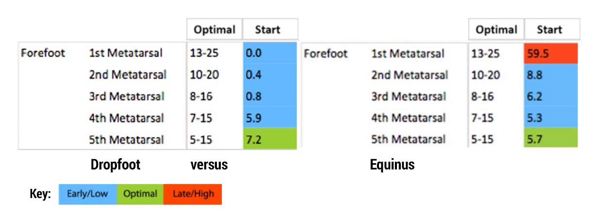 Delving further into diagnostic nuances, early metatarsal onset times also point to dropfoot. So, how do we differentiate between these 2 conditions? CAGA offers the precision required to distinguish Dropfoot and Equinus as an example. Near-instantaneous start times suggest dropfoot, while times falling between near-instantaneous and normative values lean toward an equinus diagnosis (Figure 1).