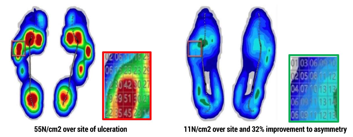 Figure 2: CAGA as treatment planning tool. Identify areas at risk with specificity and design offload mechanisms, such as those built into an orthotic, to protect these areas of concern. After creating such solutions, we can also objectively judge their efficacy and make any corrections needed to the device (78.43% reduction in pressure achieved with 32% improvement in asymmetry).1