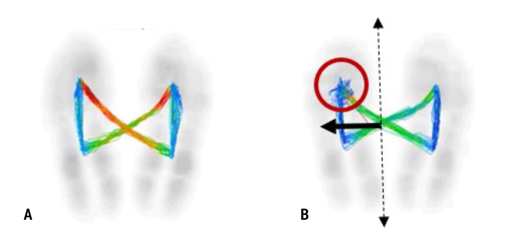 Figure 3: Comparison of A) Balanced single support phase center of pressure with Lateral Shifting at 0mm, perfect alignment, versus B) Unbalanced single support phase center of pressure intersection with variability and >8mm lateral shifting and malalignment.