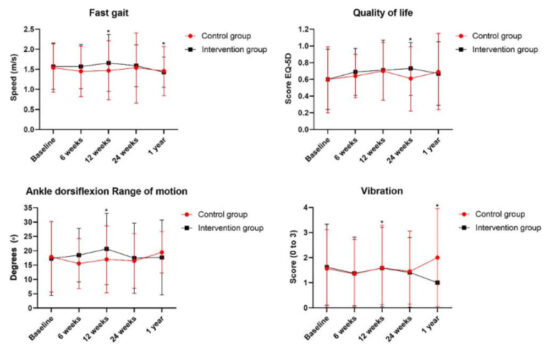 Figure. Difference between intervention group and control group on fast gait speed, quality of life, ankle range of motion and vibration outcomes.