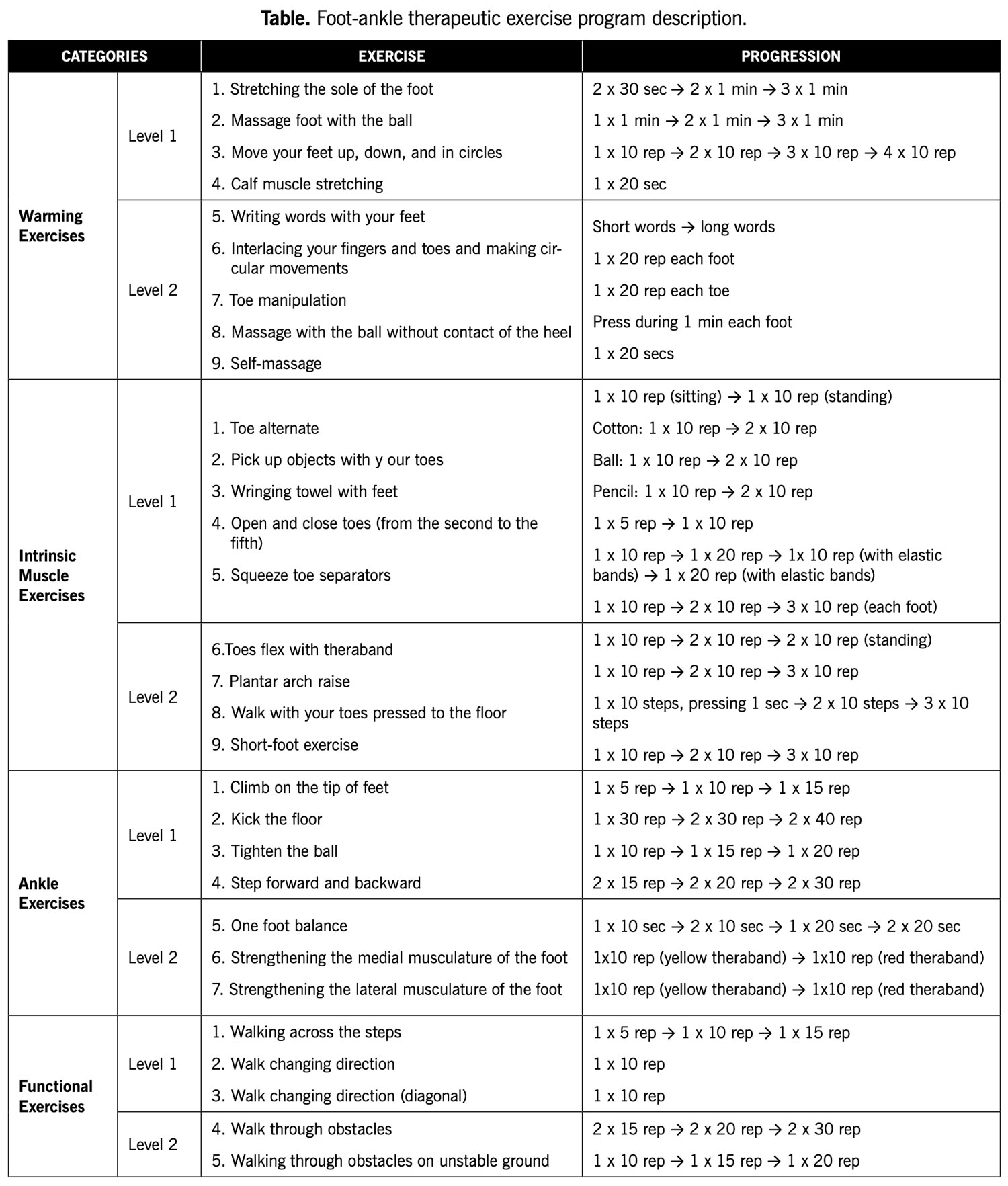 Seventy-eight volunteers with DPN were allocated into a control group (CG), which received usual care (inspect your feet daily, wear socks without elastic and seams, cut your nails properly, avoid cutting corns or blisters without supervision, avoid going barefoot or wearing shoes without socks or slippers, and seek medical attention whenever you identify foot problems), and an intervention group (IG), which received usual care plus a 12-week foot-ankle exercise program. The exercise protocol was performed twice weekly under in-person supervision by a physiotherapist, and twice weekly at home, remotely supervised through Educational Diabetic Foot Software. Both protocols consisted of warm-up exercises, intrinsic foot muscle strengthening, extrinsic foot-ankle muscle strengthening, and functional exercises, such as balance and gait training (See table on page below).