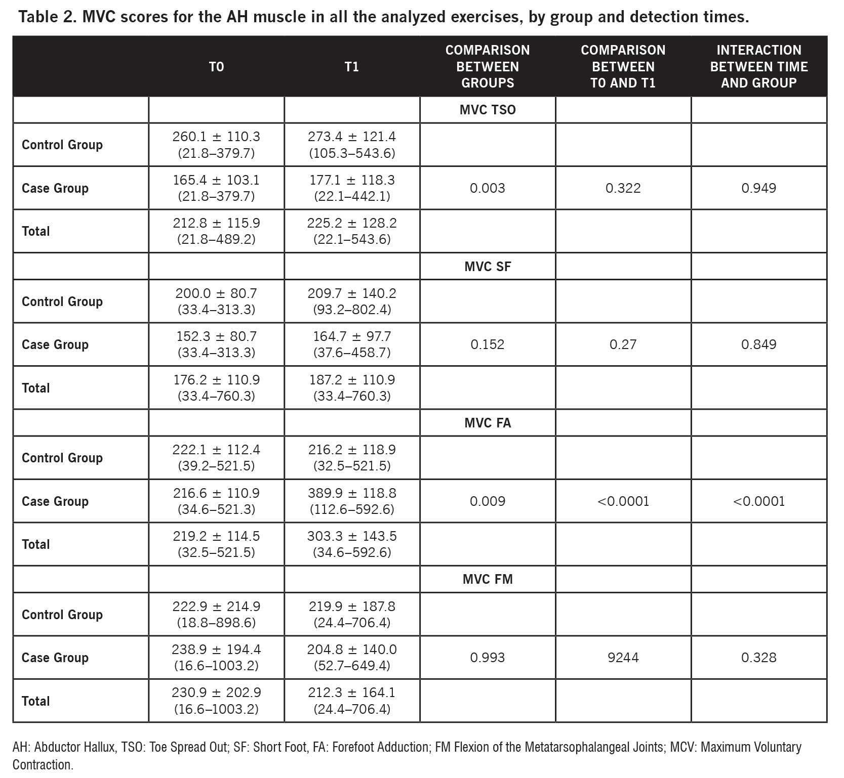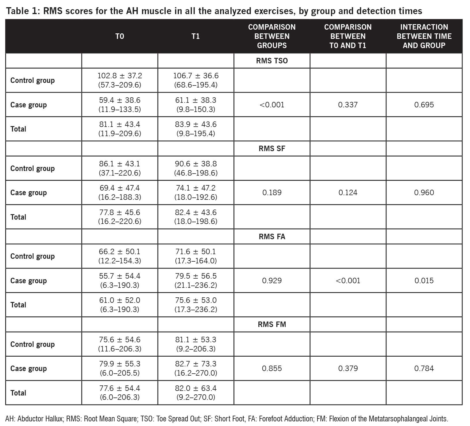 FA was the only exercise to determine a statistically significant improvement in AH at the end of the rehabilitation cycle, both in terms of RMS (P = 0.015; Table 1) and MVC (P < 0.0001; Table 2).