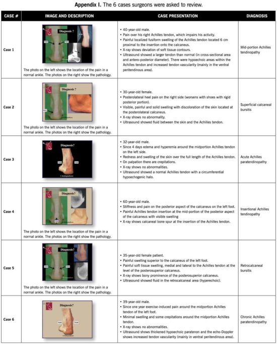 All orthopedic surgeons experienced in the field of foot and ankle surgery who are members of the Ankle Platform Study Group—Science of Variation Collaborative were invited to participate in this survey by logging on to the website www.Ankle Platform.com* (see Note at end). Fully completed responses were received from 141 of the 283 (50%) orthopedic surgeons from around the world. They were requested to fill out a survey on terminology in 6 typical cases with Achilles tendon–related disorders (see Appendix I, page 25). Participants were asked to give their preferred diagnosis for each case presented. In 5 out of 6 cases with Achilles tendon-related disorders, the majority gave an answer according to latest proposals.