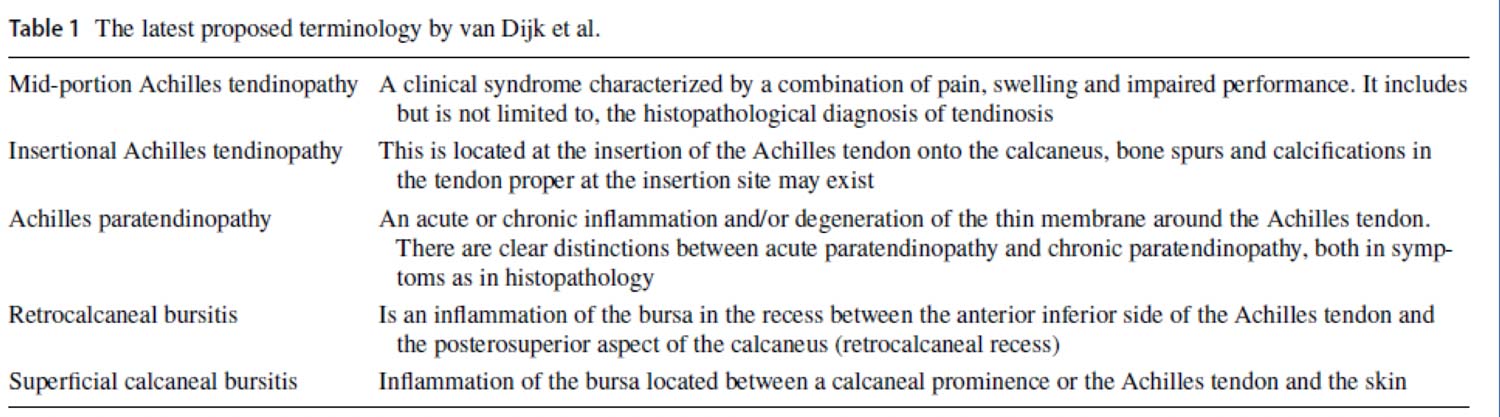 Symptoms around the Achilles tendon often have a similar presentation and it is, therefore, important to define the pathology or the combination of pathologies. For example, lack of distinction between entities, such as insertional tendinopathy and chronic retrocalcaneal bursitis, is crucial to determine further treatment and it impedes the process for researchers to perform an all-encompassing systematic review.