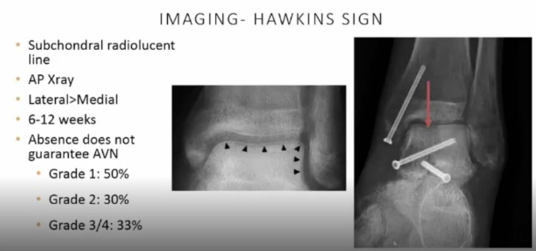 - Hawkins Classification: This system categorizes talar fractures based on the number of dislocated joints. Unfortunately, Hawkins Type III (subtalar and ankle dislocation) and Type IV (subtalar, ankle, and talonavicular dislocation) fractures are associated with a nearly 100% chance of developing AVN. This underscores the importance of early and honest discussions with patients about the potential long-term course of their injury.