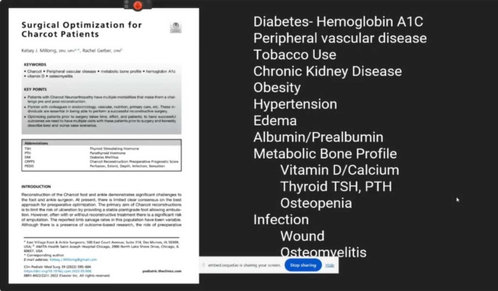 Managing Charcot soft tissue complications demands a multifaceted and systematic approach that emphasizes prevention, assessment, and strategic intervention. Proactively optimizing a patient’s overall health–including managing comorbid conditions, conducting comprehensive lab and vascular workups, and ensuring smoking cessation–lays a solid foundation for minimizing complications. When soft tissue issues arise, assuming and thoroughly evaluating for infection is critical, utilizing advanced imaging, lab tests, and biopsy/cultures to confirm the presence and nature of infections.