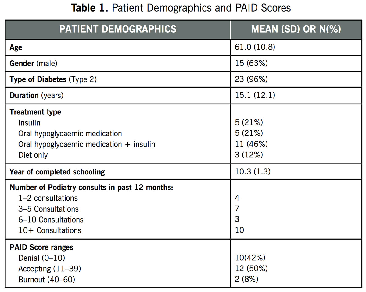 Three podiatrists and 24 patient participants were recruited for the study. Patient demographics are shown in Table 1.