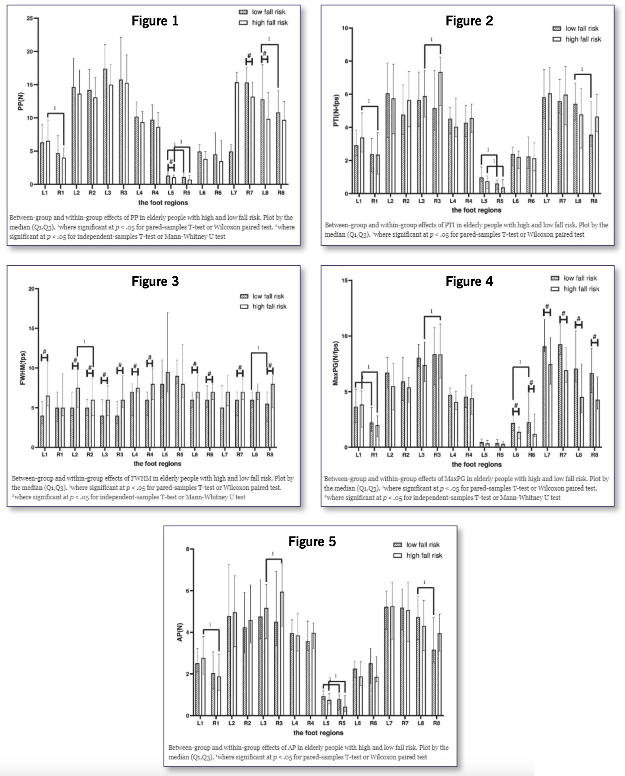 This paper prospectively investigates the relationship between fall risk and plantar pressure. The results showed that the differences in between-group comparisons were mainly focused on midfoot and heel, so the study authors assumed that HR may have been more cautious when landing. As for the comparison within the group, the differences between the left and right foot in LR occurred mainly when the heel contacted the ground, while in HR they occurred mainly when the foot stroked the ground. In the within-group comparisons between the 2 groups, the differences in foot pressure were in different areas.