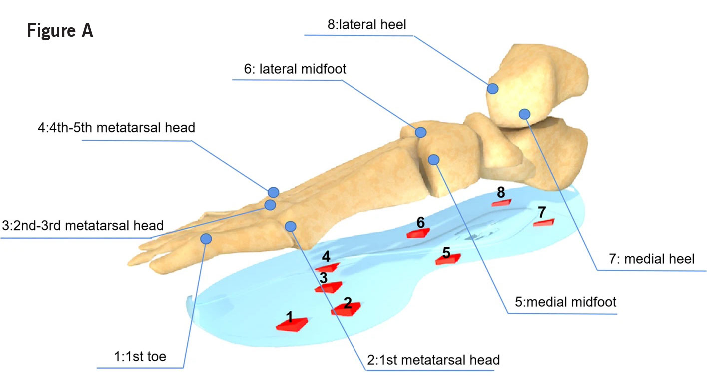 During the formal experiment, participants needed to walk for more than 2 minutes along a 20-meter corridor at their normal gait and usual walking speed. Based on previous studies combined with plantar mechanics, the plantar area was divided into 8 regions for analysis: 1st toe (T1), 1st metatarsal head (M1), 2nd-3rd metatarsal head (M2-3), 4th-5th metatarsal head (M4-5), medial midfoot (MMF), lateral midfoot (LMF), medial heel (MH), and lateral heel (LH) (See Figure A).