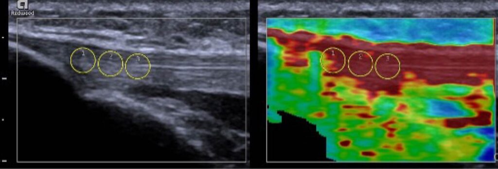 Figure 3: B-mode image of the patellar tendon (left) and an elastogram of the same region of interest (right). On the elastogram, areas of increased stiffness are indicted by dark red. Specific regions of interest can be assessed and quantified, demonstrated by the three diameter circles, which can provide different shear velocities for each region.