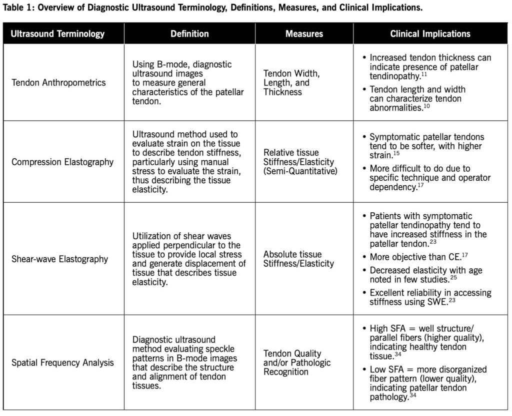 Diagnostic ultrasound is cost-effective, non-invasive, reliable, and efficient as an imaging tool that can assist clinicians with the evaluation and diagnosing of conditions like patellar tendinopathy at the point of care. Utilizing DU can provide information related to the intrinsic characteristics of the patellar tendon that can more accurately describe the current state of an abnormal patellar tendon (Table 1). These can be leveraged to provide guidance to clinicians in terms of understanding the pathology, creating treatment and rehabilitation protocols for altered tendon morphology, and informing clinical decision making.
