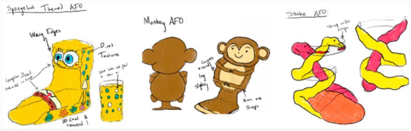 The project also explored the potential of additive manufacturing to create more comfortable and engaging AFOs for children. This approach sought to mitigate non-compliance caused by discomfort and unappealing designs, while advancing functionality and esthetic appeal. Our methodology encompassed concept development, prototyping, testing, and iterative refinement. Beyond meeting functional requirements, these solutions must also address esthetic and psychological factors to enhance the overall user experience.