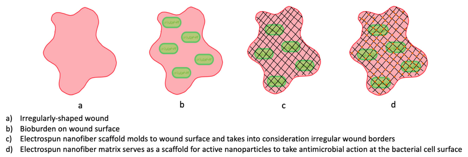 Nanoparticle-based treatments and therapies have been of recent interest largely due to their versatility. The ability of electrospun fiber dressings to be loaded with therapeutic nanoparticles allows them to function as a bioactive dressing tailored to address the deficiencies inherent in chronic wounds.9 There is a growing list of multi-drug resistant bacteria, and a high percentage of chronic wounds have a biofilm where resistance is transferred from bacteria to bacteria.52 The need for multifunctional dressings designed to target biofilms and reduce the formation of surface bioburden is great.
