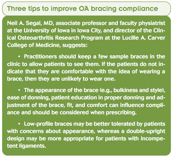 Neil A. Segal, MD, associate professor and faculty physiatrist at the University of Iowa in Iowa City, and director of the Clinical Osteoarthritis Research Program at the Lucille A. Carver College of Medicine, wrote a review of bracing last year6 and agreed that identifying patients who are most likely to benefit from bracing can be tricky (see sidebar for tips).