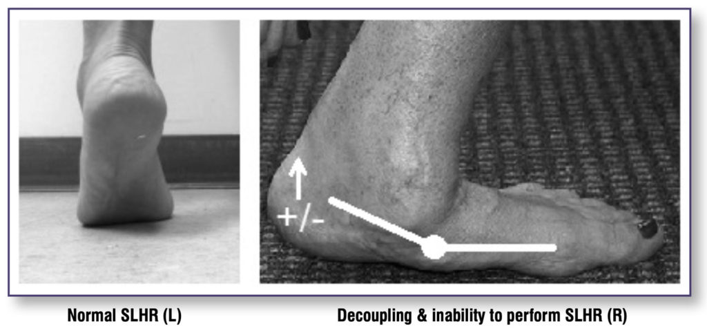 In the early stages, a client will be able to perform the SLHR, and we will observe a diminished or the absence of calcaneal inversion, indicating TP insufficiency (see Figure 4). As the pathology progresses a decrease in heel raise height will occur, further progressing to decoupling of the foot-leg and eventual inability to perform the SLHR.