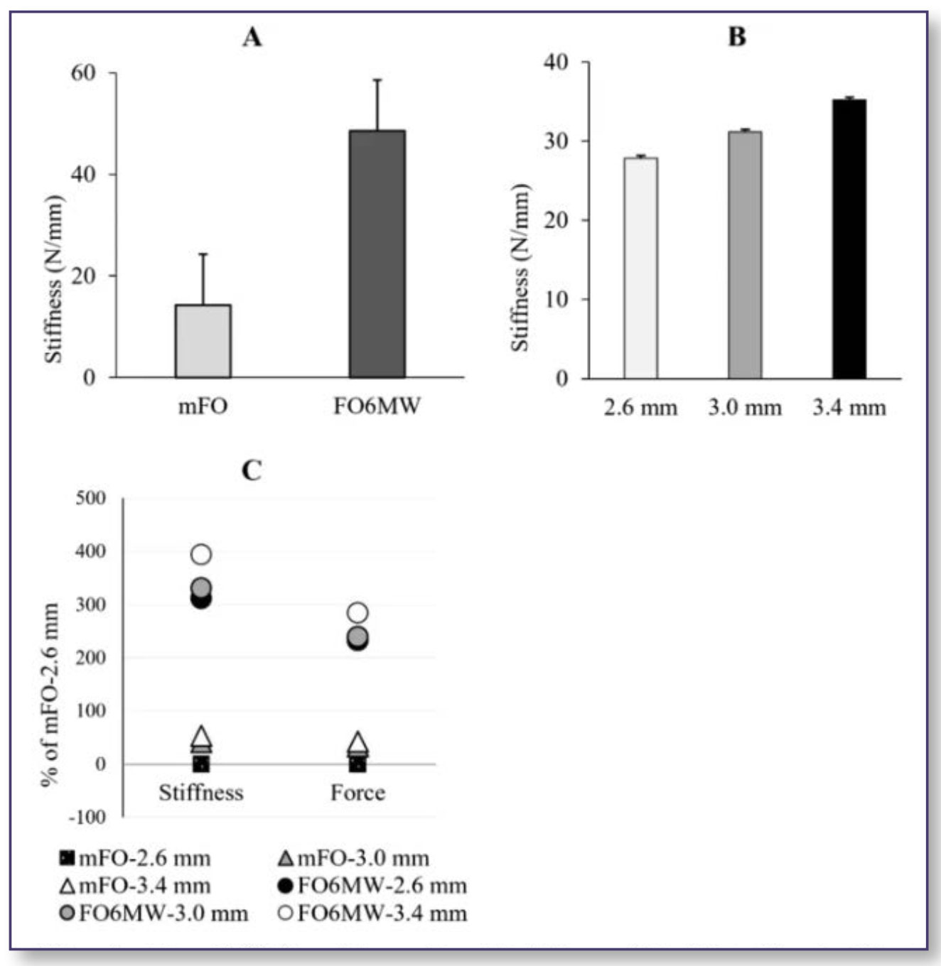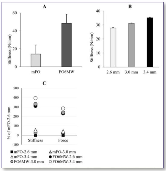 Figure 1. A) Stiffness in mFO and FO6MW models regardless of the thickness effects. B) FOs stiffness in different thicknesses, regardless of models. C) The ratio (%) of increased stiffness and force as a result of adding medially wedged forefoot-rearfoot posts, and increasing the thickness.