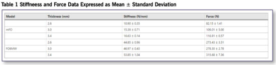 A better understanding of how the medial arch stiffness of FOs can be modulated by changing structural factors is necessary to better customize FOs for patients. The objectives of this study were to compare FOs stiffness and force required to lower the FOs medial arch in 3 thicknesses and 2 models (with and without medially wedged forefoot-rearfoot posts).
