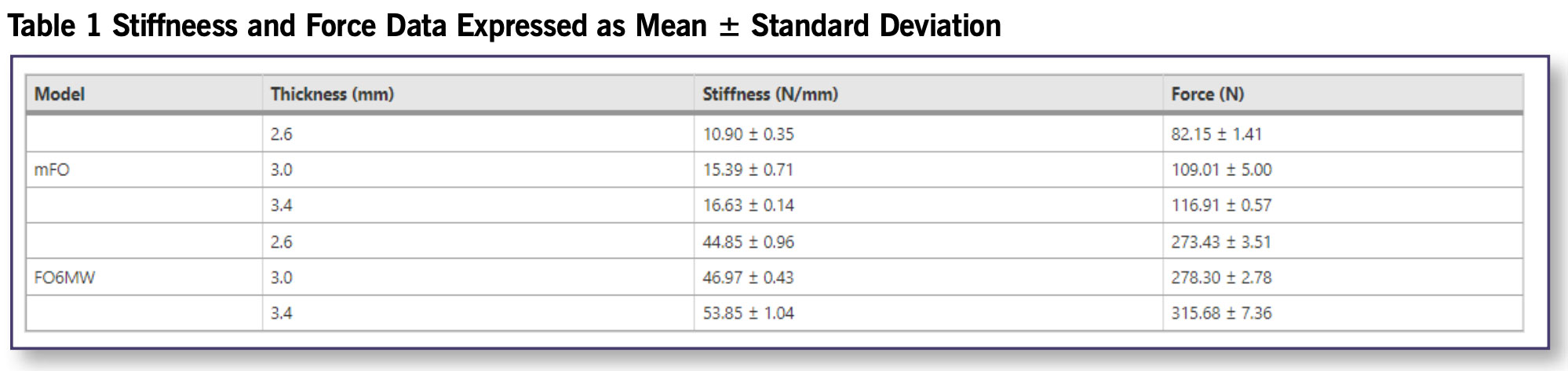 Two models of FOs, 3D printed in Polynylon-11, were used: (1) without extrinsic additions (mFO), and (2) with forefoot-rearfoot posts and a 6-degree medial wedge (FO6MW). For each model, 3 thicknesses (2.6mm, 3mm, and 3.4mm) were manufactured. FOs were fixed to a compression plate and vertically loaded over the medial arch at a rate of 10mm/minute. Two-way ANOVAs and Tukey post-hoc tests with Bonferroni corrections were used to compare medial arch stiffness and force required to lower the arch across conditions.