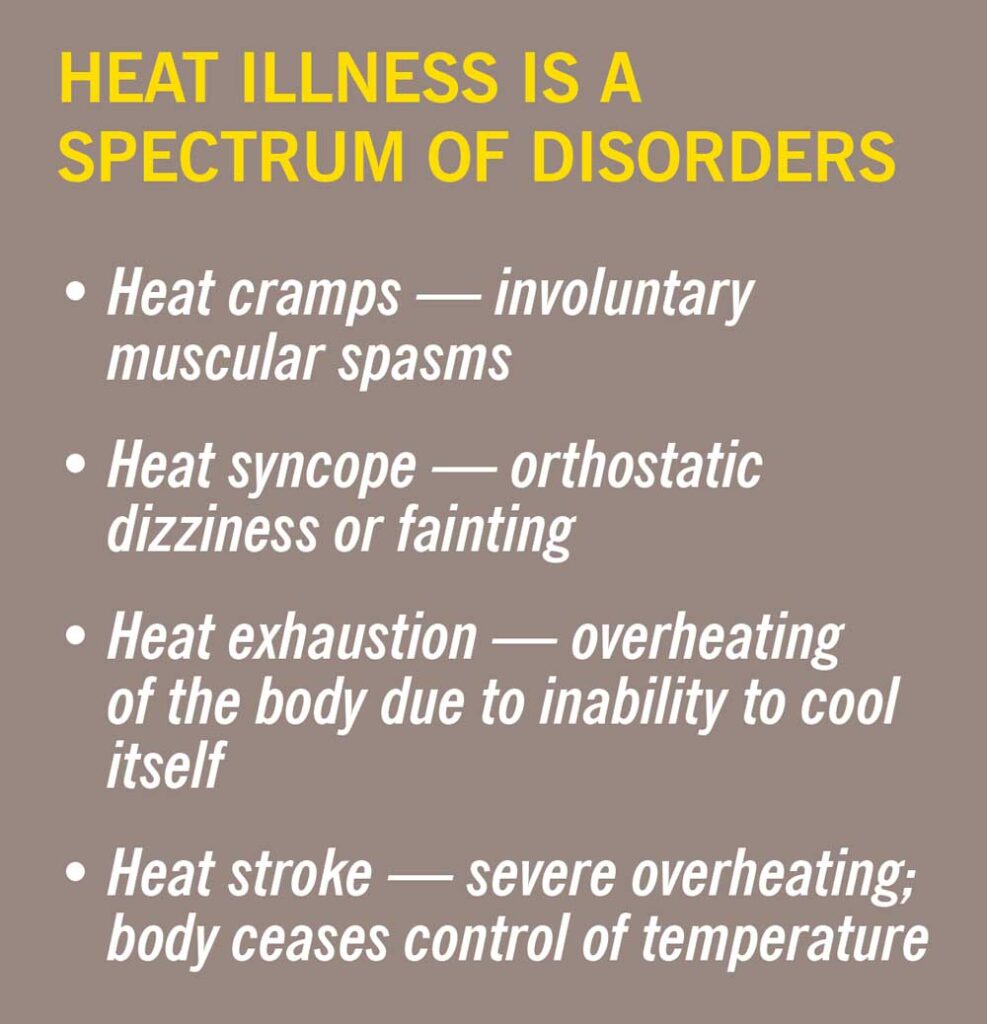 Heat illness is a spectrum of disorders that are caused by increased body temperature (see box). It can derive from environmental conditions and/or exertion. Heat illness includes conditions such as heat cramps, heat syncope, heat exhaustion and heat stroke. Signs and symptoms of exertional heat illness are headache, dizziness, confusion, disorientation, excessive sweating, fatigue, chills, nausea, vomiting, increased heart rate, rapid breathing, low blood pressure, and/or seizures. A core body temperature greater than 105 is extremely dangerous and can cause life-threatening complications.