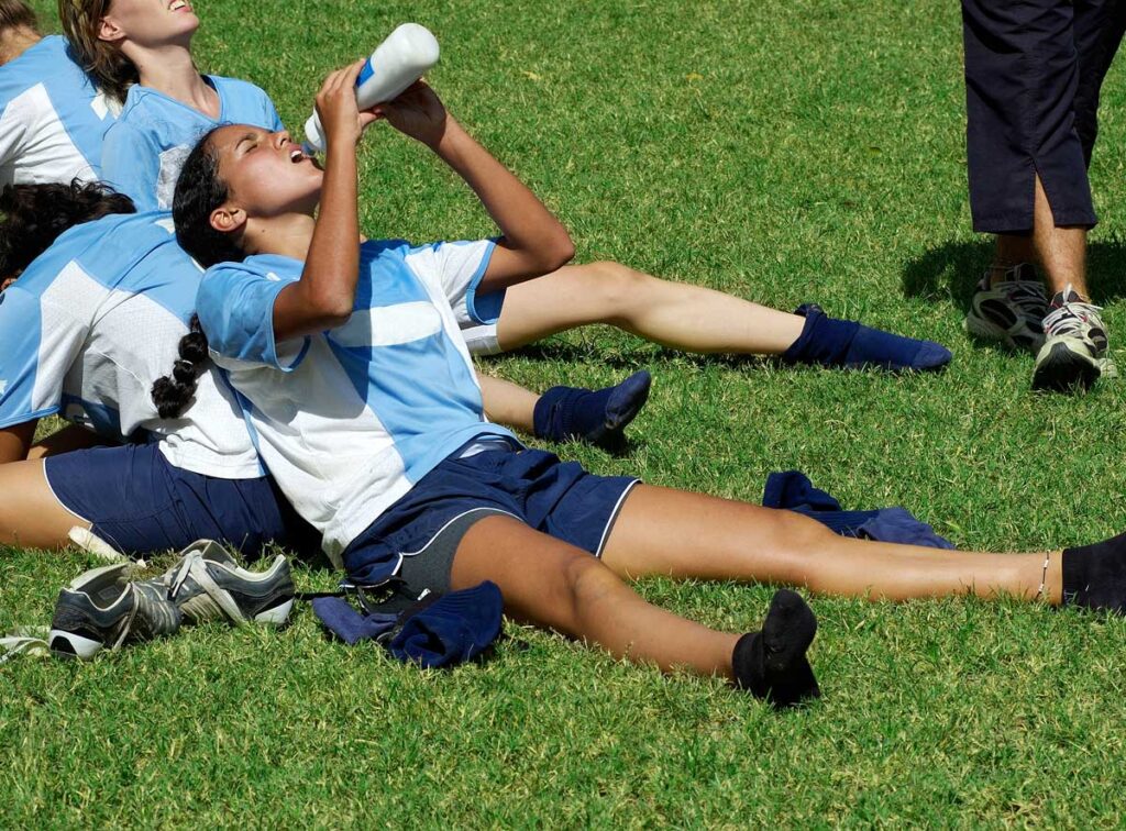 Hot temperatures can make outdoor activity challenging. Proper hydration and nutrition are essential to beat the heat. Water and sports drinks are vital for fluid replacement due to sweat loss. Sports drinks contain essential electrolytes, such as sodium and potassium, to aid in hydration. Young athletes should drink at least half their body weight in ounces per day. For example, an athlete that weighs 160 pounds should drink at least 80 ounces of water daily. Urine color that is light yellow like lemonade, not apple juice, is a key sign of hydration. Proper hydration must be implemented before, during, and post activity.