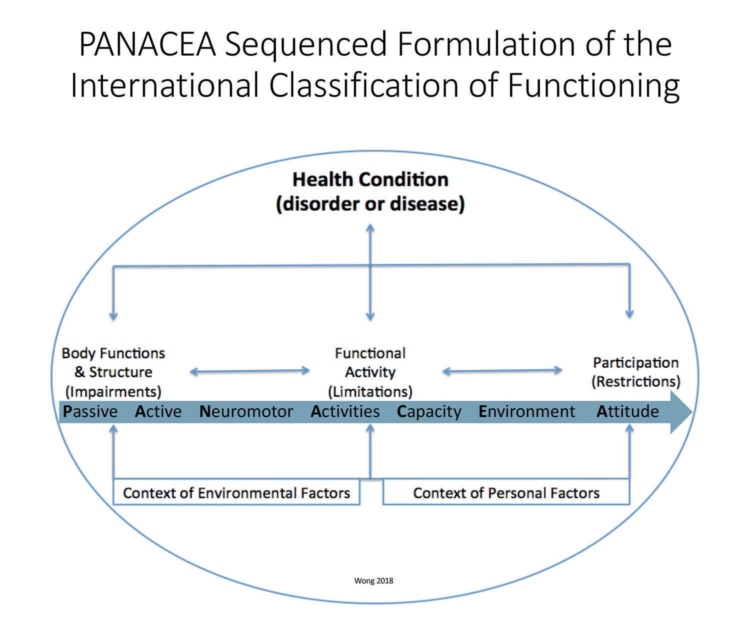 Figure 2: The International Classification of Functioning (ICF) model describes an individual’s health condition considering personal and environmental factors that affect them in the context of their body’s impairments, that lead to functional limitations, and can ultimately restrict full participation in life. The PANACEA sequence optimizes a person’s participation by addressing all ICF elements in logical order from impairments to functional activities to requirements for life participation. Minimizing passive restraints to movement, activating musculature, and neuromotor coordination enables active participation in building the cardiopulmonary capacity needed for real life social and physical environments. Attitude is a personal factor that must be always addressed. This figure is the author’s adaptation from his prior work, Graham E, Johnson M, Wong CK. Return to running after rehabilitation for chronic 16-year cremaster strain: a case study. J Orthop Sports Phys The Cases. 2024;4(3):146-152. https://doi.org/10.2519/josptcases.2024.0007.