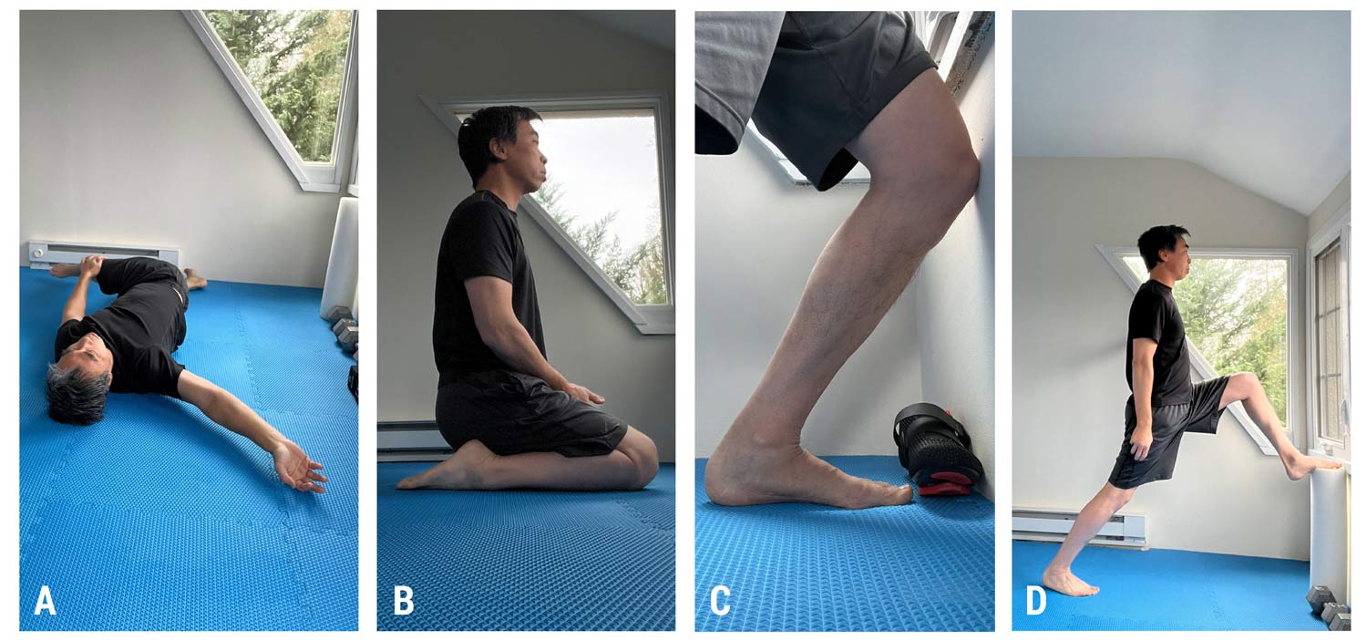My plan was to optimize my movement potential as I do for my athlete patients so that my body could be as efficient as possible. The first of the 3-step plan was to ensure movements were not limited by fibrosis, often thought of as adhesions or scar tissue, that forms in response to injury but also immobility and affect passive structures such as nerve, joints, and myofascia—the fascia that surrounds all muscle.4 For example, when nerves exiting the spine are restricted, full innervation can be affected and the target muscles weakened; but nerves can be easily mobilized by maintaining spine range-of-motion.5 Joints can be kept healthy by maintaining full range-of-motion and myofascia maintained flexible with simple stretching (Figure 1).6 Joints and fascia can sometimes be addressed together, such as ankle joint dorsiflexion with soleus muscle stretch or knee joint flexion with ankle and midfoot joint plantarflexion and shin muscle stretch. As a physical therapist, I mobilized my joints and muscle fascia by maintaining firm pressure on stiff areas while moving the surrounding joints. Obtaining full joint range-of-motion and muscle flexibility can sometimes be difficult, which is a good reason to consult a skilled manual therapy focused physical therapist.