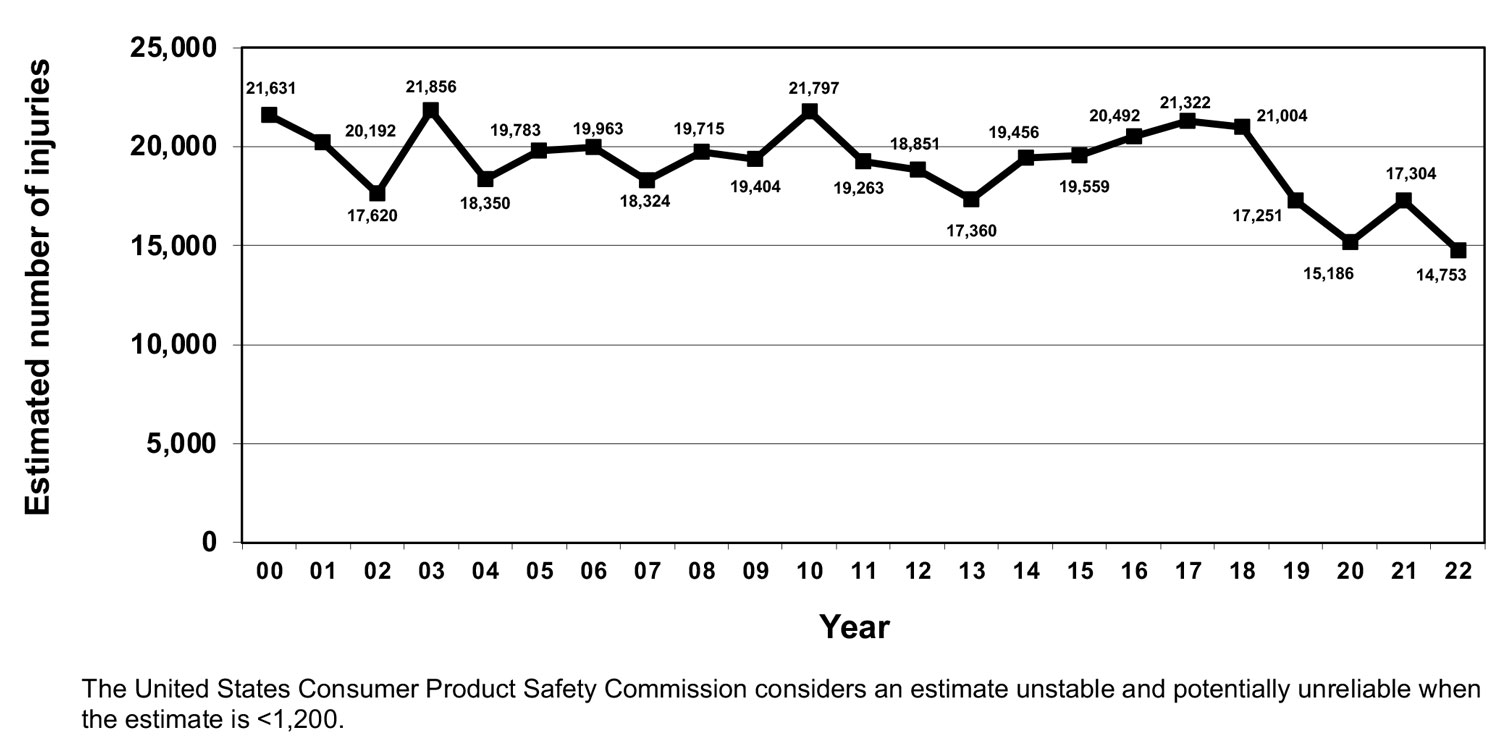 - United States Consumer Product Safety Commission. National Electronic Injury Surveillance System (NEISS). Available at https://www.cpsc.gov/Research–Statistics/NEISS-Injury-Data/Explanation-Of-NEISS-Estimates-Obtained-Through-The-CPSC-Website. Accessed April 1, 2024.