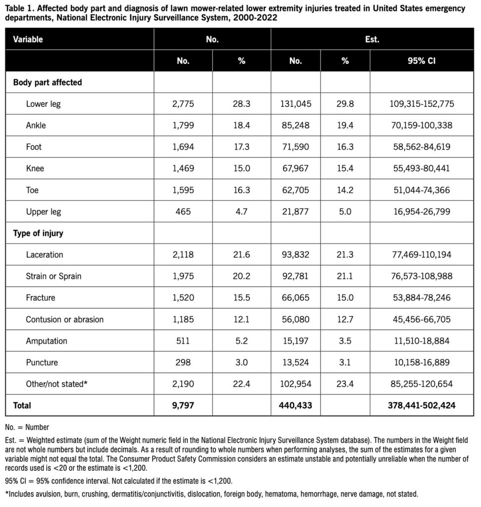 During 2000-2022, 9,797 lawn mower-related lower extremity injuries were treated at a sample of US hospital EDs, resulting in a national estimate of 440,433 (95% CI 378,441-502,424) lawn mower-related lower extremity injuries. This represents 22.9% of the 1,919,146 total estimated lawn mower-related injuries affecting any body part. Among the estimated lower extremity injuries, the type of lawn mower associated with the injury was 92,133 (20.9%) riding lawn mowers or garden tractors, 76,964 (17.5%) power lawn mowers (not specified), 31,979 (7.3%) rotary power lawn mowers, 10,861 (2.5%) manual push mowers (unpowered), 1,109 (0.3%) reel power lawn mowers, and 227,387 (51.6%) lawn mowers (not specified).