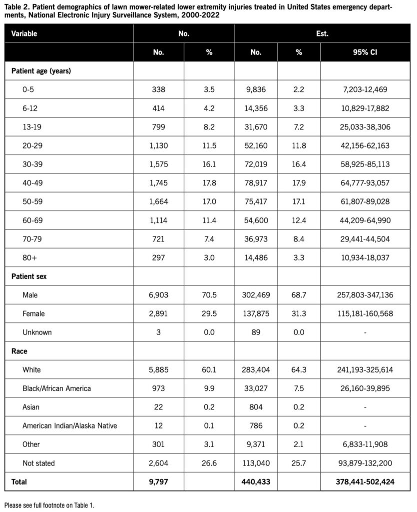 Methods: This study used lawn mower-related lower extremity injuries during 2000-2022 reported to the National Electronic Injury Surveillance System (NEISS), a database of consumer product-related injuries treated at a representative sample of US hospital EDs. Cases reported to the NEISS were used to calculate national injury estimates. The distribution of lawn mower-related lower extremity injuries was determined for patient demographics, injury circumstances, and management.