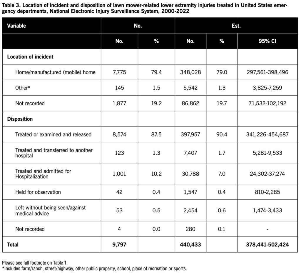 Furthermore, the study only included injuries treated at hospital EDs. Information on injuries treated elsewhere might provide a more complete perspective of lawn mower-related injuries.