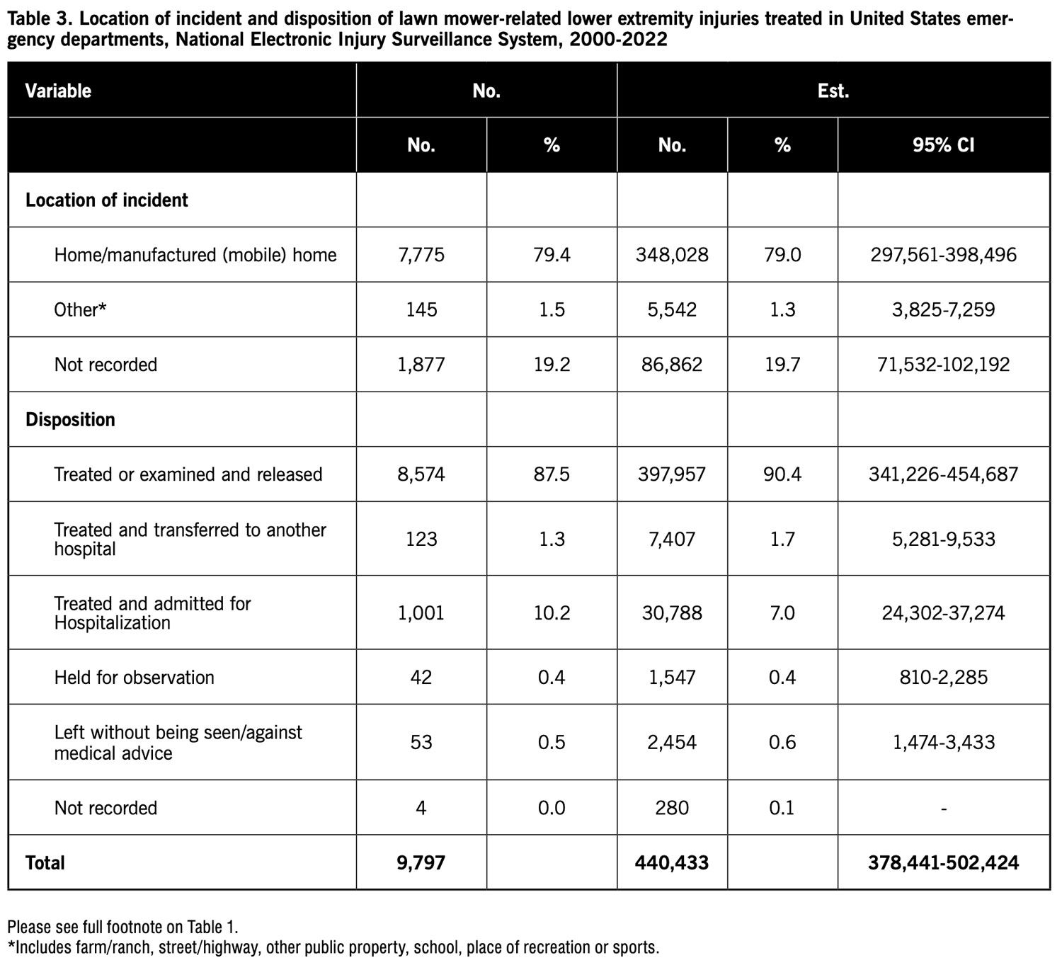 The variables examined were treatment year, month, and day of week; patient age, sex, and race; type of lawn mower involved, based on the product code; location where the incident occurred; type of injury (diagnosis); affected body part; and disposition. Analyses were performed using Microsoft 365 Access and Excel (Microsoft Corporation, Redmond, Washington, US). For all lawn mower-related lower extremity injuries, the distribution of cases and national injury estimates were determined for the variables. National injury estimates were calculated by summing the values in the Weight numeric field in the publicly available NEISS database, and 95% confidence intervals (CIs) were calculated for the estimates. The CPSC considers an estimate unstable and potentially unreliable when the number of records used is <20 or the estimate is <1,200.13 For those variable subgroups where the estimate was <1,200, 95% CIs were not calculated.