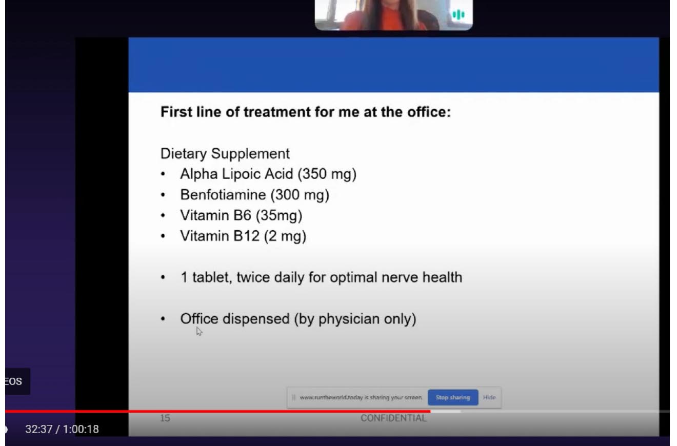 First line of treatment for me at the office (Figure 6), when it’s a mild to moderate small fiber neuropathy, is to start with vitamins as discussed earlier: alpha lipoic acid, benfotiamine, vitamins B6 and B12. Make sure that they’re not already taking B12; if they are, you need to tell them not to take any more. And the reason is B12’s toxicity. If they’re taking too much B12, it can actually worsen neuropathy symptoms. The supplement that I have at the office suggests 1 tablet twice daily for optimal nerve health. There are many supplements out there that can be office dispensed, so just make sure you’re looking at the dosage as well as all the ingredients. I found that the alpha lipoic acid and benfotiamine make a huge difference. Even my patients who have been on the supplement for months and months and decide to do something over-the-counter, as long as we keep them on the alpha lipoic acid and benfotiamine, their symptoms are well managed and they’re well controlled.