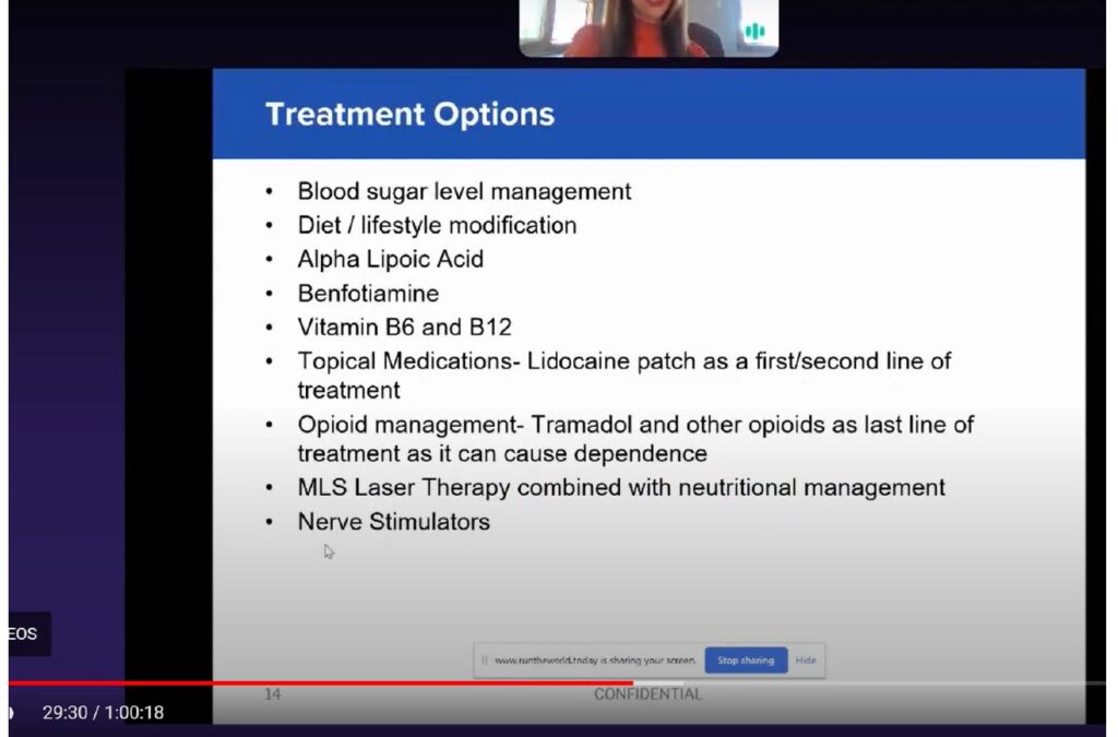 Contrary to what many believe, we have lots of treatment options available Figure 5. First and foremost, if a patient is pre diabetic or already has diabetes, we want to incorporate blood sugar level management, diet, and lifestyle modifications, so getting them exercising, having a healthy diet. Plus, there are certain vitamins that are important for health of the nerve: alpha lipoic acid, benfotiamine, and vitamins B6, and B12. The next level of treatment is topical creams or compounded creams/medications, and lidocaine patches. Those are, of course, always an option for daily pain management. The next level is opioid management, ideally on a temporary basis as it can lead to dependence. And then finally, MLS laser therapy combined with nutritional management. As a last resort, nerve stimulators where you’re referring patients out to a pain specialist. Once you get the patient’s results, you can see how much you need to do based on the severity of their disease and the results.