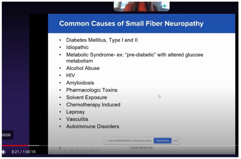 Common causes of small fiber neuropathy are listed in Figure 1. It’s not always frank diabetes. There are a lot of other reasons that a patient could have this type of neuropathy. For example, patients who are prediabetic with altered glucose could have this, and about 67% of the US population is prediabetic – so really anybody could have neuropathy-type symptoms.