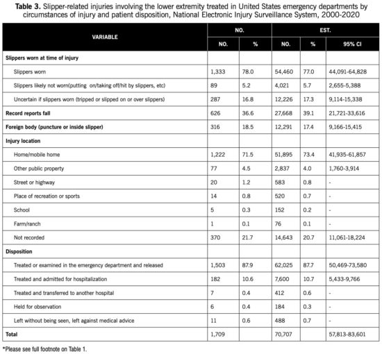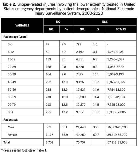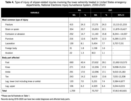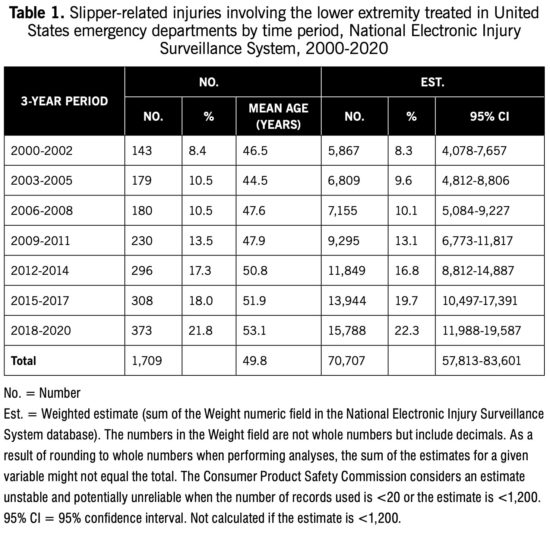 Methods: An analysis was performed of slipper-related injuries of the lower extremity using data from the National Electronic Injury Surveillance System (NEISS) of the US Consumer Product Safety Commission (CPSC) during 2000-2020.