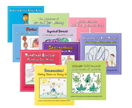 The Strength of My Scars is an innovative children’s book series created to instill comfort and hope in pediatric patients and their families. Written by surgeon Maria Baimas-George, MD, MPH, these stories serve as a valuable supplement to conversations with medical professionals with the goal of improving comprehension and satisfaction and reducing anxiety. They are meant to empower children and help them feel safe, teaching them that their scars tell a story of resilience, of which they can be proud. Each book addresses the anatomy, pathophysiology, hospital course, surgical details, and post-operative care pertaining to a specific condition using easy to understand language and colorful visual aids.