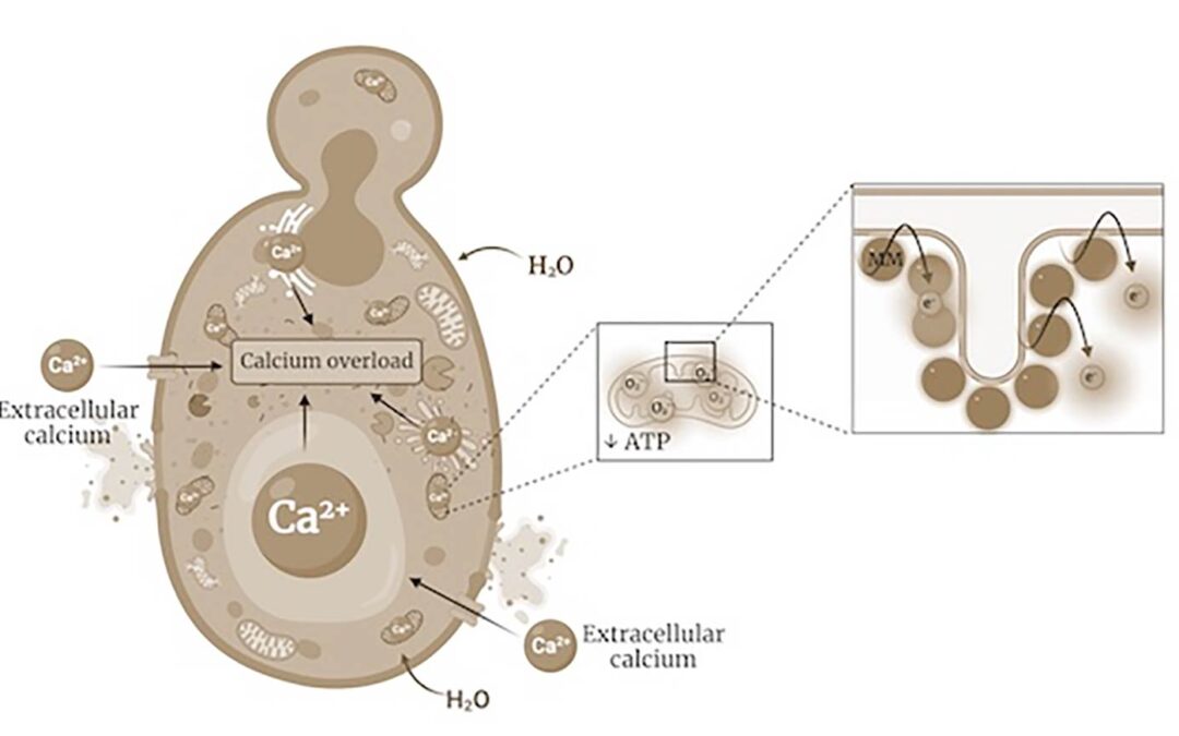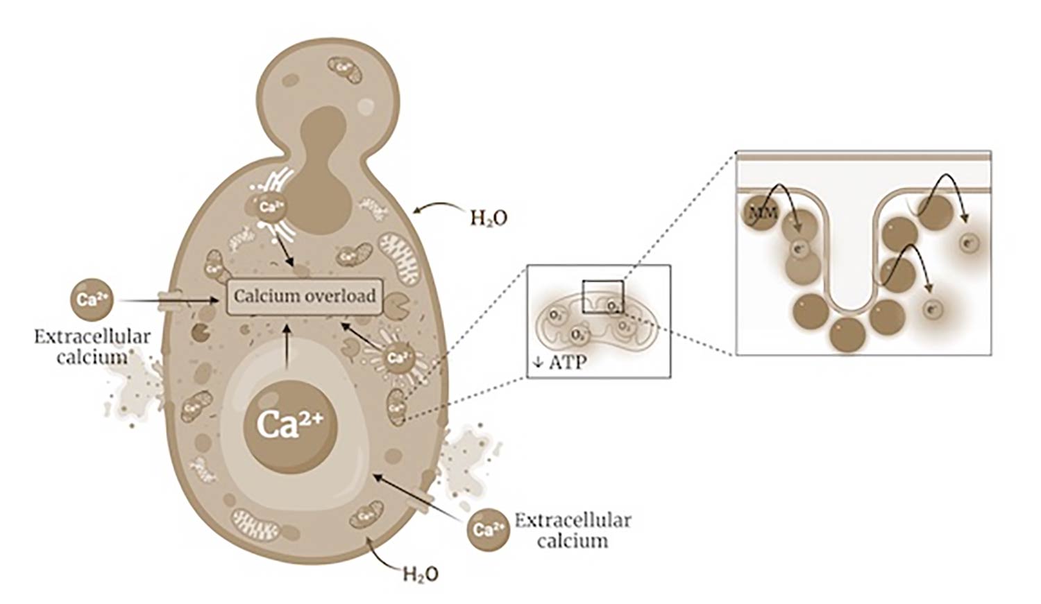 Schematic representation of the mechanisms by which light-activated molecular machines kill fungi. Molecular machines bind to fungal mitochondria, decreasing adenosine triphosphate production and impairing the function of energy-dependent transporters that control the movement of ions, such as calcium. This leads to the influx of water, which causes the organelles to swell and eventually the cells to burst. Image courtesy of Tour Group/Rice University.